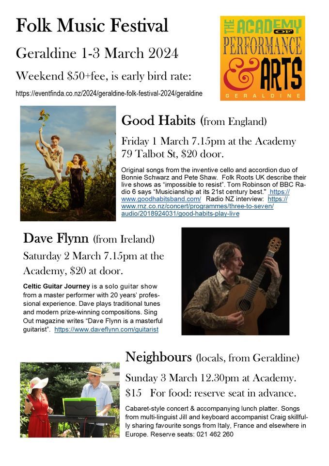 Source : art4now.comFolk Festival Concerts: 1, 2 and 3 March 2024 , Geraldine Academy